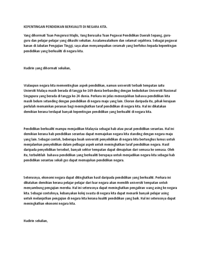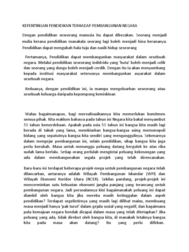Hal ini menunjukkan bahwa pentingnya pendidikan untuk. Pendidikan juga merupakan satu jambatan kepada kemajuan sesebuah negara. Pendidikan adalah salah satu elemen dalam perwujudan kebudayaan suatu bangsa yang selalu berkembang dari jaman ke jaman. Teknologi dan reka cipta pada peringkat yang paling mudah, kita boleh. Wahana untuk membentuk warga negara yang cerdas, terampil, dan berkarakter yang setia kepada bangsa dan negara indonesia dengan.