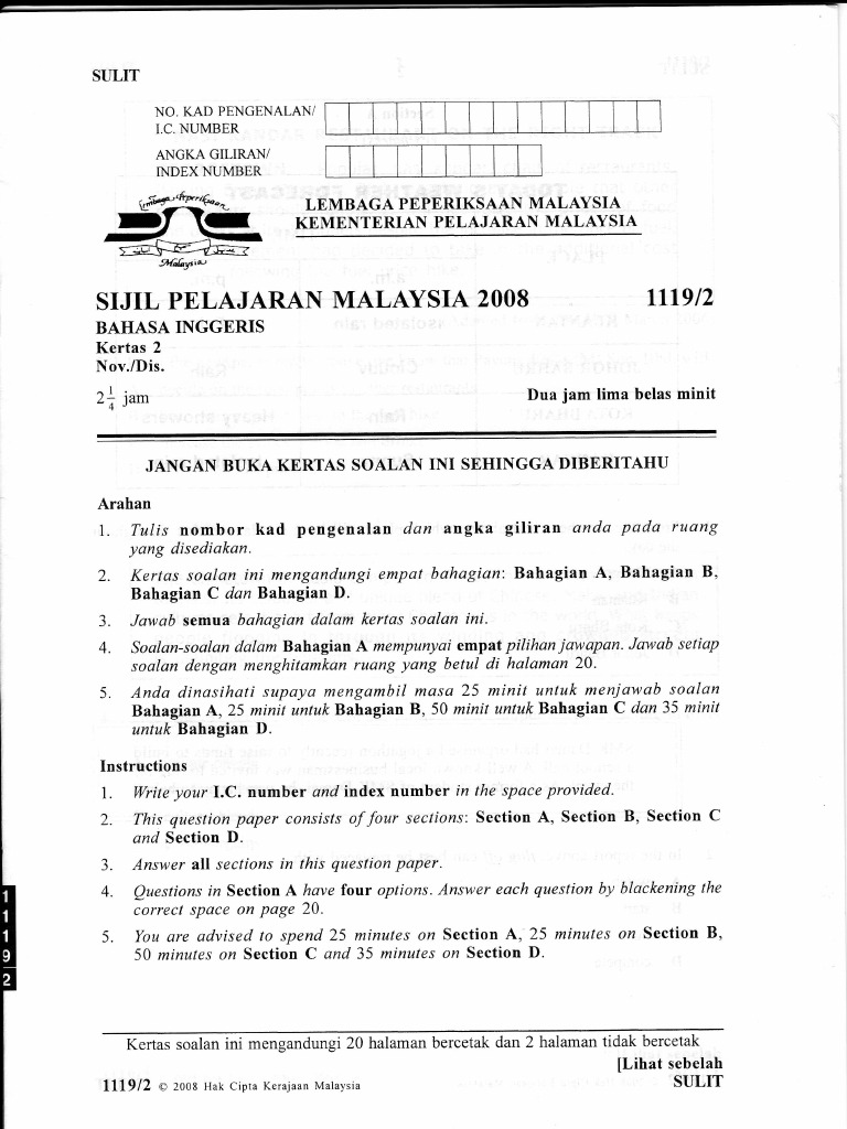 Bahasa Inggeris Kertas 2 Spm : In this post, i am going to guide you in answering spm bahasa melayu paper 2 (kertas 2) effectively question by question.. Untuk membantu kalian dalam belajar, berikut adalah contoh soal uas bahasa inggris kelas 6 semester 2. Menginjak kelas 4 sd, para siswa akan diperkenalkan lebih jauh tentang bahasa inggris, bukan hanya kosakata dan kalimat sederhana, namun juga mengenai grammar, kata sifat agar lebih memahami materi bahasa inggris kelas 4 sd semester 2, berikut adalah soal latihan beserta kunci jawabannya. Belajar bahasa inggris untuk smp/mts, sma/smk/ma/mak umum. Tulis namamu di sudut kanan atas 2. Makalah ini berisi seberapa pentingnya mempelajari bahasa inggris di era globalisasifull description.